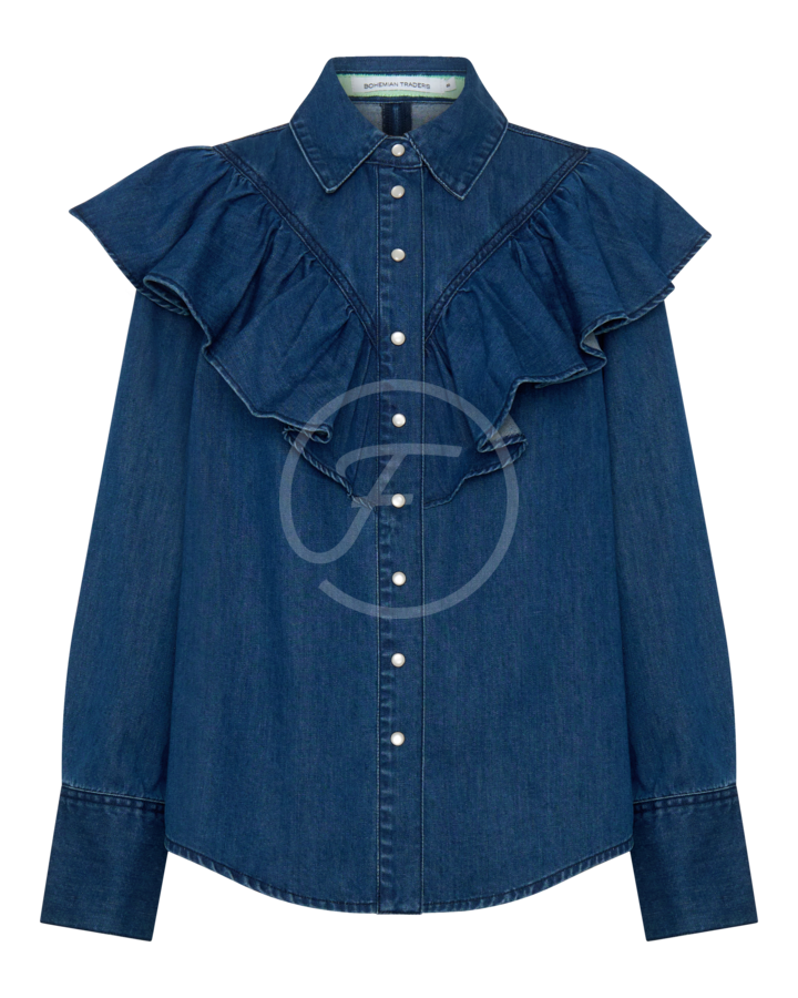 RUFFLE DENIM SHIRT IN MID BLUE