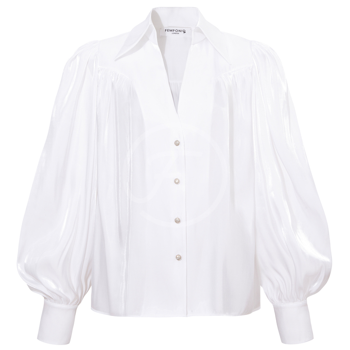 Puff Sleeve V-Neck Gathered Shirt (Sheer White)