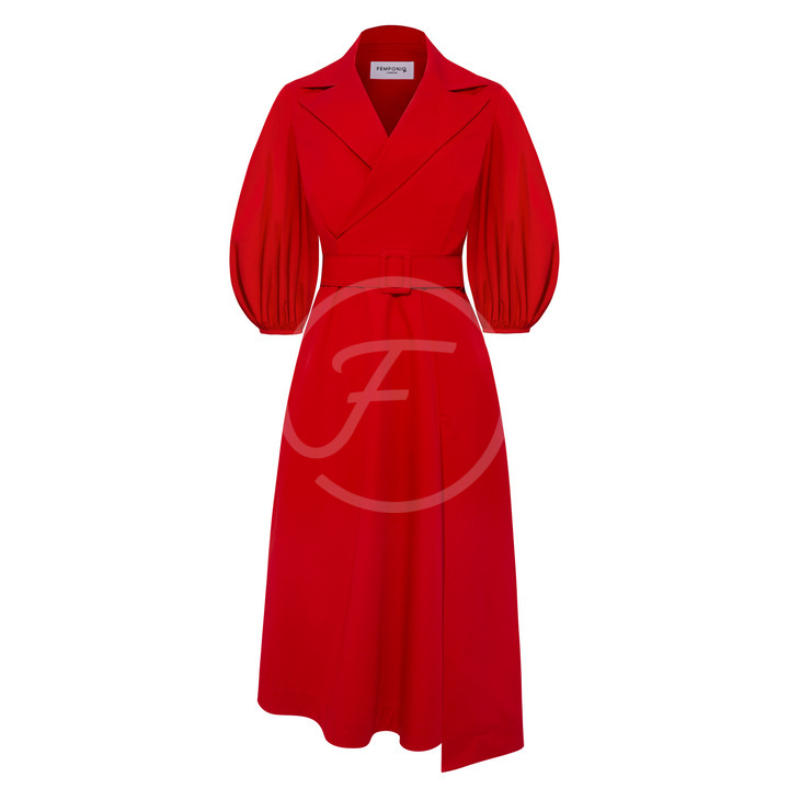 Wide Lapel Asymmetric Red Belted Dress