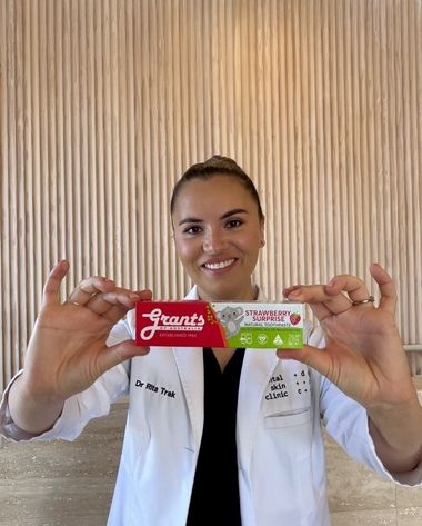 Dr. Rita Trak with Grants Strawberry Toothpaste